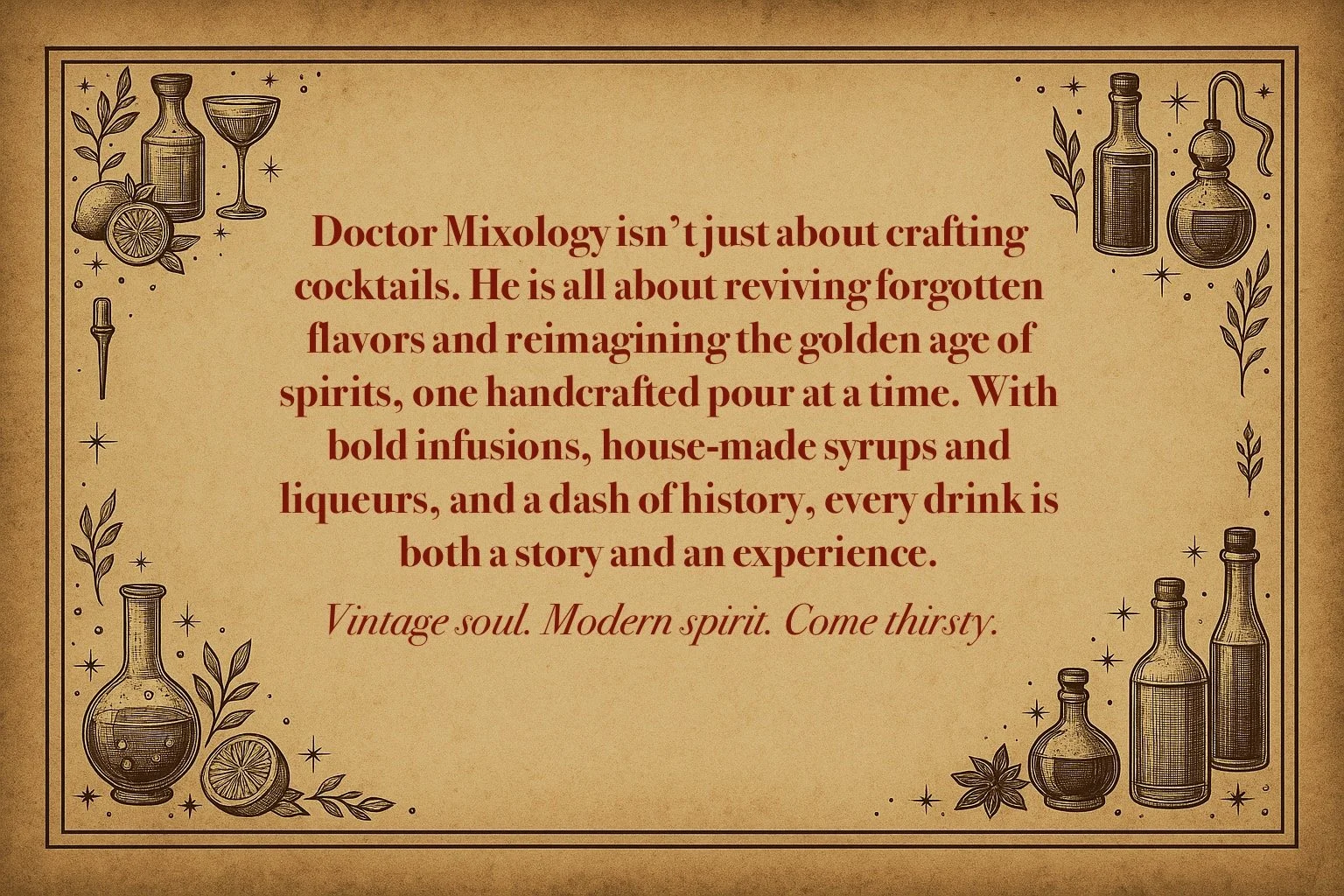 Doctor Mixology The Handcrafted Cocktails - the old fashioned way Doctor Mixology Ethos Learn more Follow the Doc on social